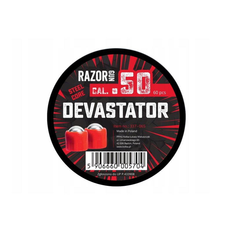 RazorGun Steel Core Devastator kal. .50 60 szt. został wyprodukowany w Polsce. Produkt zgłoszono do Urzędu Patentowego P.433908.
